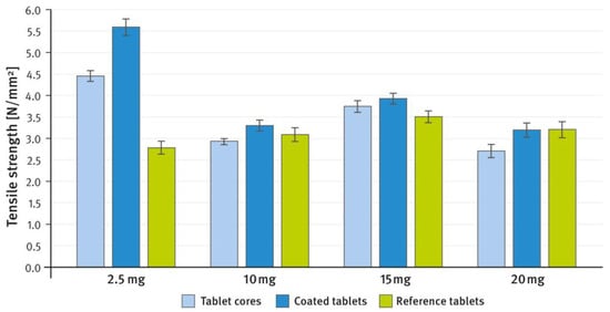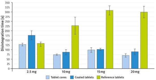 Figure 2 and Figure 3, respectively, compare the hardness (expressed as tensile strength) and disintegration time of tablet cores and coated tablets prepared as described in paragraph 2.1 of the Materials and Methods section with reference tablets of the same weight. Friability was measured only for uncoated tablets (tablet cores) and amounted to 0.16%, 0.08%, 0.20%, and 0.29% for 2.5 mg, 10 mg, 15 mg, and 20 mg tablets, respectively. According to pharmacopeial requirements, a maximum weight loss of no more than 1% is considered acceptable for most tablets. The analytical procedures are given in paragraph 2.3 of the Materials and Methods section.