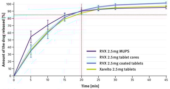 The dissolution testing was performed as described in paragraph 2.4 of the Materials and Methods section, using the USP apparatus 2 (paddle method). A comparison of the results obtained for 2.5 mg, 10 mg, 15 mg, and 20 mg doses is shown in Figure 4, Figure 5, Figure 6, and Figure 7, respectively. The magenta/purple lines represent the dissolution curves recorded for multiparticulate formulations, the light blue lines for tablet cores, and the dark blue lines for film-coated tablets. The green lines indicate the release profiles of the corresponding reference tablets, Xarelto®. The red dotted lines represent the requirement in the USP/NF monograph for Rivaroxaban Tablets, i.e., no less than 85% of the drug must be released within 20 min for the 2.5 mg strength, and no less than 85% within 15 min for the 10 mg, 15 mg, and 20 mg strengths (Q value set to 80%). A compilation of dissolution profiles of RVX analyzed for MUPS formulations in the form of free pellets (multiparticulates) using the USP apparatus 2 is shown in Figure 8.