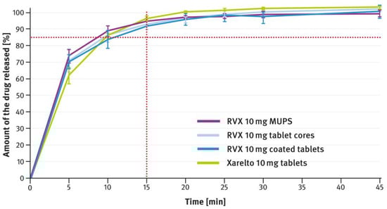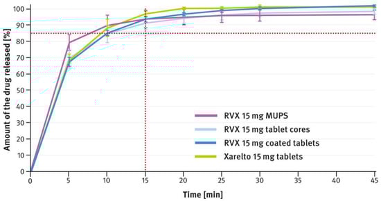 Comparison of the dissolution profiles of RVX 15 mg formulations (multiparticulates, tablet cores, and film-coated tablets) with Xarelto® 15 mg film-coated tablets. Means of n = 6; SD is indicated by the error bars.