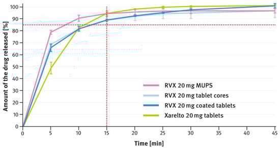 Comparison of the dissolution profiles of RVX 20 mg formulations (multiparticulates, tablet cores, and film-coated tablets) with Xarelto® 20 mg film-coated tablets. Means of n = 6; SD is indicated by the error bars.
