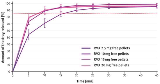 Comparison of dissolution profiles of various doses of RVX multiparticulates (free pellets) analyzed with the paddle apparatus. Means of n = 6; SD is indicated by the error bars.