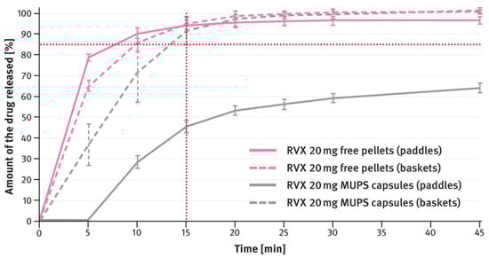 Comparison of the dissolution profiles of RVX 20 mg MUPS formulations (free multiparticulates and capsules) analyzed with the paddle and basket methods. Means of n = 6; SD is indicated by the error bars.