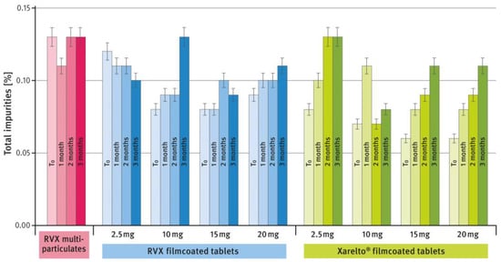 Comparison of the changes in total impurities content within 3-month storage under the stress conditions (50 °C/80% RH) of RVX multiparticulates, RVX film-coated tablets, and Xareltlo® film-coated tablets; SD is indicated by the error bars.