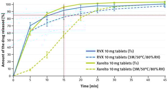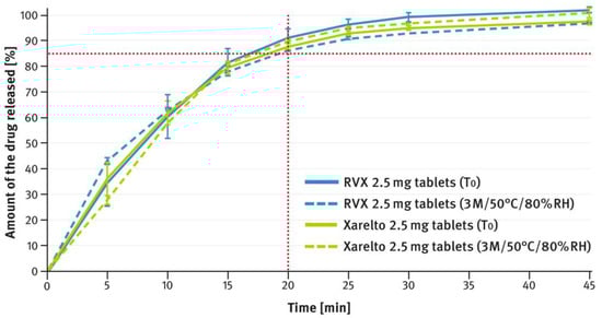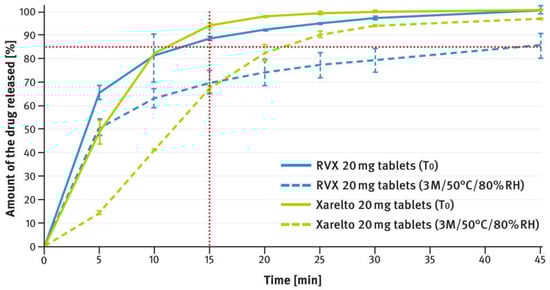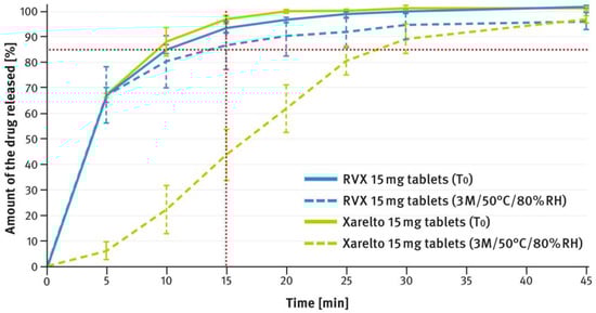 Figure 12, Figure 13, Figure 14, Figure 15 and Figure 16 illustrate the stability of the tested RVX formulations in terms of their dissolution behavior, as described in paragraph 2.4 of the Materials and Methods section. For the 2.5-mg tablets, there were virtually no apparent changes in the dissolution profiles measured at time 0 and after 3 months of storage under stress conditions, for both the reference drug product and the RVX tablets developed in this study (see Figure 12). As the RVX dose increased, more noticeable changes in the drug release profiles from the tablets became evident. Additionally, differences were observed between the dissolution pattern of the reference drug product and the developed RVX tablets. In both cases, the coating systems were based on HPMC, suggesting that the variations may be attributed to the different properties of the fillers/diluents used. For example, the moisture and temperature susceptibility of soluble lactose versus insoluble DCPA could account for some of the observed differences. During storage under high moisture conditions, lactose particles could dissolve on the surface and stick together, resulting in a significant reduction in the penetration of liquid into the interior of the tablet. A similar phenomenon, as well as the effect of soluble fillers/diluents on tablet disintegration and subsequent drug release, has been described elsewhere previously [52,53,54,55]. Nevertheless, the results indicate that the poorly soluble RVX is highly sensitive to adverse conditions, leading to significant changes in its dissolution rate. Therefore, during pharmaceutical development, studies should be conducted to select the optimal packaging material that protects the dosage form from moisture.
