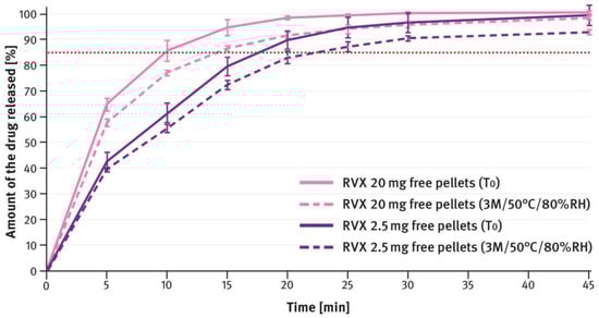 Comparison of dissolution profiles of RVX multiparticulates, 2.5 mg and 20 mg strengths, at time 0 (T0) and after 3 months (3 M) of storage under stress conditions (50 °C/80% RH). Means of n = 6; SD is indicated by the error bars.