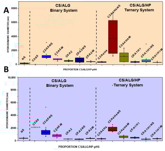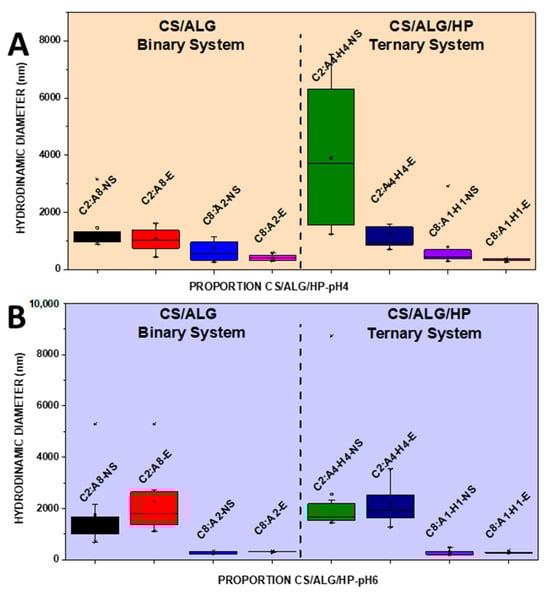 Boxplot summary for stability studies of CS/ALG and CS/ALG/HP. Hydrodynamic diameter measured at (A) pH 4 and (B) pH 6.