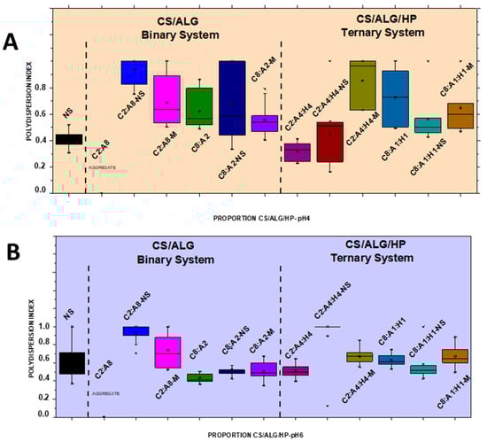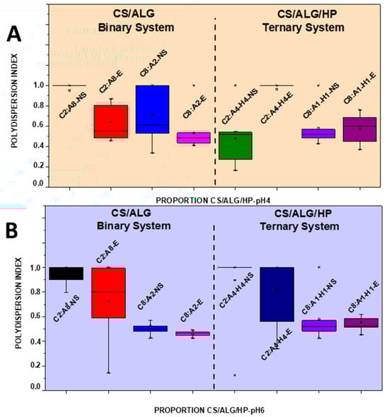 Boxplot summary for stability studies of CS/ALG and CS/ALG/HP. Polydispersity index measured at (A) pH 4 and (B) pH 6.