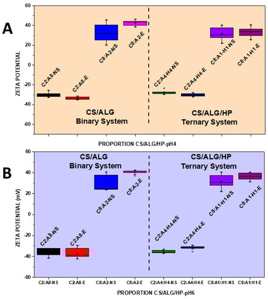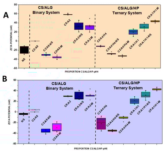 Boxplot summary for stability studies of CS/ALG and CS/ALG/HP. Zeta potential measured at (A) pH 4 and (B) pH 6.