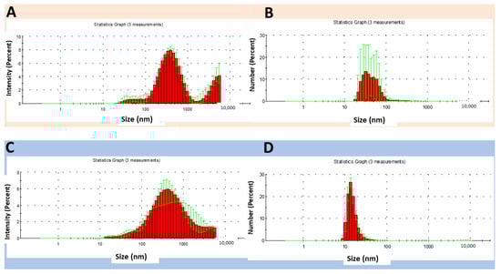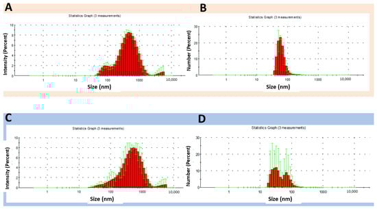 Size distribution of binary system C8:A2-NS at pH 4, expressed as the intensity (A,B) number of particles; (C) intensity and (D) number of particles at pH 6.