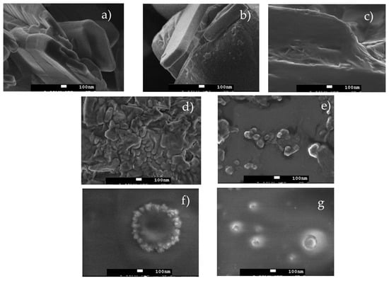 Analysis of the morphology using scanning electronic microscopy with 30,000× magnification. (a) MSZ powder, (b) MSZ-NS pH 4, (c) MSZ-NS pH 6, (d) CS/ALG + NS at pH 4, (e) CS/ALG + NS at pH 6, (f), CS/ALG/HPMC + NS ternary system at pH 4, (g), CS/ALG/HPMC + NS ternary system at pH 6.
