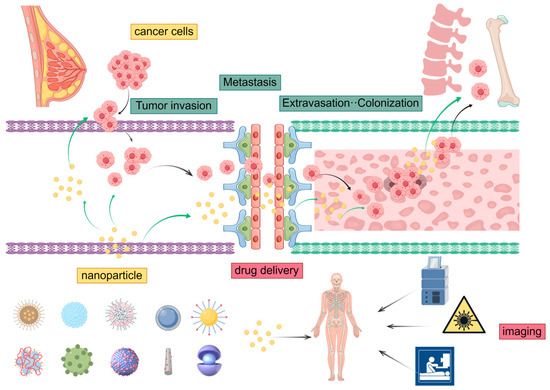 Specially designed nanoparticles can also serve as contrast agents for cancer diagnosis, facilitating high-sensitivity and high-resolution imaging for tumor detection. Furthermore, novel methods of tumor labeling and detection may be realized through the utilization of nanoprobes and nanobiosensors. By rationally designing and fabricating nanodrug carriers, the goals of targeted drug delivery in cancer therapy can be achieved. Additionally, nanoparticles can be employed for radiation sensitization and photothermal therapy to improve the treatment of malignant tumors [41]. DDSs effectively integrate diagnosis and treatment strategies for bone metastasis. However, challenges such as drug penetration barriers must still be addressed.