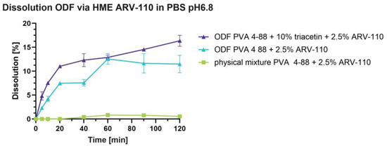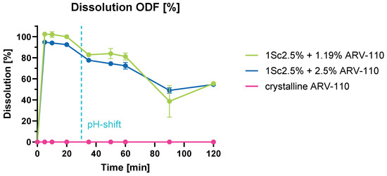 Figure 6 shows results from these dissolution experiments, indicating, again, the dissolution enhancement of ARV-110 through processing. The raw material, ARV-110, displays no measurable dissolution during the pH shift measurements, while for both formulations, a highly notable enhancement is determined. For the formulation containing a theoretical 1.19% API, the calculated amount of ARV-110 in the pieces of films previous to the dissolution test was 0.82% ± 0.09% (STDV n = 3). Meanwhile, for the formulation containing a theoretical 2.5% API, in the single pieces of films was calculated a 2.0% ± 0.067% (STDV n = 3) of ARV-110 before the dissolution test. Both formulations follow a similar dissolution profile over the pH-shift measurements and 120 min; in fact, even if they have a different concentration, the drug release profile is very similar, probably because between 1% and 2% of ARV-110 concentration, a saturation point in the physiological buffer is reached. With ARV-110 being a weakly basic API, dissolution is expected to be higher in acidic pH, which can be observed in Figure 6. With the change to pH 6.8, dissolution values decrease. However, in the case of ODFs through solvent casting in the buffer with pH 6.8, the drug release is much higher compared to the films through HME. Both ODF formulations can inhibit precipitation in PBS at pH 6.8.