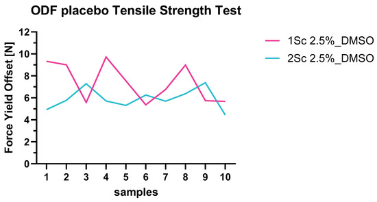 Both placebo ODF formulations were investigated for their yield offset (Figure 4). The average forces of the yield offset are ~7.4 N ± 1.8 N for the PVA 4-88 formulation and ~ 5.9 N ± 0.9 N for the PVA 5-88 formulation.