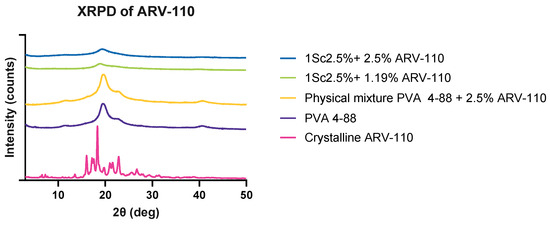 Both formulations, containing 1.19% and 2.5% ARV-110, show the halo in the XRPD with no indication of crystalline peaks, as seen for the raw ARV-110 (Figure 5). As discussed earlier, this is due to the low amount of API. The films also showed a broad peak at 20° related to PVA, which was less pronounced compared to raw PVA, also indicating a reduction of crystallinity in these samples.