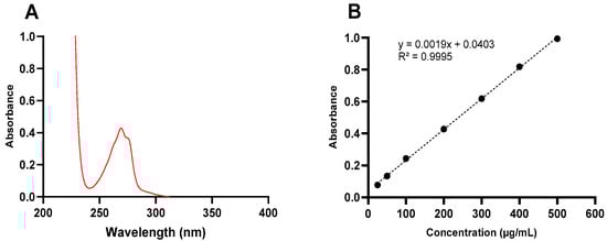The absorption spectra of ketamine HCl in aqueous solution is shown in Figure 2A. The λmax was found to be 269 nm. Because the λmax was found to be similar in all evaluated mediums (water, CB pH 3.5, CB pH 5.5, PBS pH 7.5, and PBS pH 9.5) and was not affected by the pH of the dissolution medium, the same wavelength (269 nm) was used for all further measurements of ketamine HCl concentration. A calibration curve was constructed in the range of seven concentrations (25–500 µg/mL), as shown in Figure 2B. As illustrated in Table 1, the regression equation was y = 0.0019x + 0.0403, with an R2 of 0.9995. The LOD refers to the lowest concentration of an analyte that can be reliably detected but not necessarily quantified, while LOQ refers to the lowest concentration of an analyte that can be quantitatively measured with acceptable precision and accuracy, and they were found to be 3.39 and 10.27 µg/mL, respectively. Table 2 illustrates the results obtained for repeatability (intra-day) and intermediate precision (inter-day). In the case of the intra-day analysis, the RSD% results ranged from 1.21% to 4.43%, while the RE% ranged from 2.07 to 2.64%. In the case of the inter-day analysis, the RSD% ranged from 0.52 to 4.32%, while the RE% ranged from 0.56 to 1.08%.