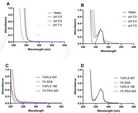 Interference of the solvent or surfactants employed in the solubilization of drugs could lead to inaccurate measurements of the drug’s concentration []. In this regard, the interference in the different solvents (water, CB pH 3.5, CB pH 5.5, and PBS pH 7.5) that could be employed during the solubilization of ketamine HCl for IN delivery were evaluated. Interference was assessed by considering whether significant differences were observed at λmax (269 nm). As shown in Figure 3A, no peak was observed in any of the ketamine HCl-free solvents around 269 nm, while the results demonstrate well-defined peaks at the absorbance wavelength of 269 nm in the presence of ketamine HCl (Figure 3B). Moreover, surfactants typically absorb in the ultraviolet region of the spectrum, and thus, could alter the drug quantification using UV-Vis spectrophotometry [,]. Therfore, the interference of four surfactants (1% SDS, 1%PLX 407, 1%PLX 188, and 1%PEG 400) was also assessed, and clearly, no interference in the absence of ketamine HCl at λmax (269 nm) was observed (Figure 3C) in comparison to the well-defined peaks at the absorbance wavelength 269 nm, in the presence of ketamine HCl (Figure 3D). The absence of interference stems from the presence of an aromatic moiety in keamine that is absent in all evaluated surfactants in this study, resulting in a defined peak for examination at 269 nm. Similarly, Rapalli et al. also reported that no interference between the employed surfactants and buffers of the release media in the quantification of curcumin was observed [].