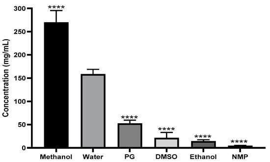 Solubility of ketamine HCl in different co-solvents. Data are expressed as mean ± SD (n = 3). Statistical significance was calculated using 1-way ANOVA and Dunnett’s test (**** p < 0.0001 indicate statistical significance compared to water).