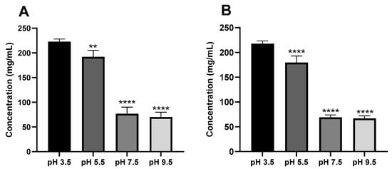 Solubility of ketamine HCl as a function of pH in (A) 0.1 M CB and (B) 0.1 M PBS. Data are expressed as mean ± SD (n = 3). Statistical significance was calculated using 1-way ANOVA and Dunnett’s test (** p < 0.01, and **** p < 0.0001 indicate statistical significance compared to the pH 3.5 condition).
