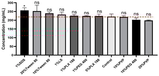 Solubility of ketamine HCl with different surfactants in CB with pH 3.5 (control) with different surfactants. Data are expressed as mean ± SD (n = 3). Statistical significance calculated using 1-way ANOVA and Dunnett’s test (ns = not significant, * p < 0.05 indicate statistical significance compared to the control).