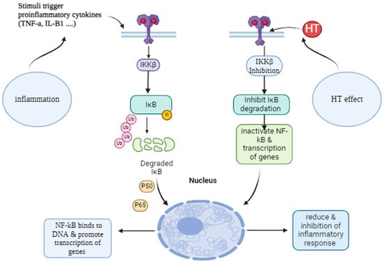 Anti-inflammatory effect of HT on NF-kB signaling pathway. Created with BioRender.com. https://app.biorender.com (accessed on 28 August 2024).