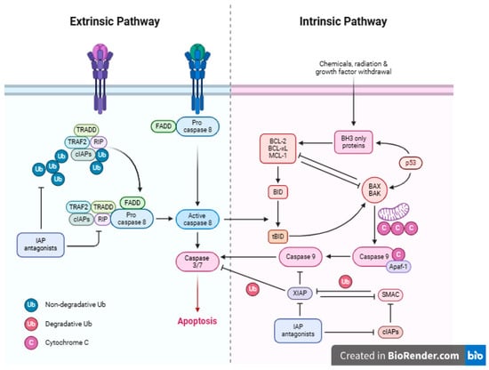 Extrinsic and intrinsic apoptosis pathway. Created with BioRender.com. (https://app.biorender.com (accessed on 28 August 2024).