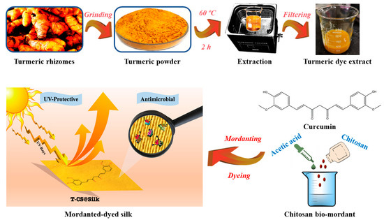 Curcuminoids, the naturally occurring polyphenolic molecules found in the rhizomes of turmeric (Curcuma longa L.) plants of the family Zingiberaceae, are highly valued in the market due to their wide range of applications as a food spice [24], colourant [25,26], and medicinal substance [27,28]. Curcumin can be regarded as a biocompatible compound when utilized at appropriate concentrations [29,30,31]. Its chemical structure facilitates interactions with microbial cell molecules, resulting in notable biological features, including its capacity to suppress the growth of various pathogenic colonies [32,33,34]. In addition, chitosan, an animal-based polysaccharide chemically comprising (14)-linked D-glucosamine, has been effectively exploited as an antimicrobial agent in both its individual form and composite designs due to its biological activity that disrupts the structures and functions of microbial cell walls and membranes [35,36]. The role of chitosan as a bio-mordant in textile dyeing with natural colourants has also been recognized in a number of studies by virtue of its capability to generate robust dye complexes and adhere to targeted fibres [37,38,39]. The present research entails the utilization of a turmeric dye extract while employing chitosan to be a nature-based mordant to create silk substrates exhibiting an antimicrobial performance and UV protection. The chromatographic method was employed to confirm the existence of curcuminoid-based compounds in the dye extract derived from turmeric rhizomes. A chitosan pre-treatment followed by dyeing with turmeric extract was implemented on silk with the purpose of determining its antimicrobial activities against Escherichia coli (E. coli), Staphylococcus aureus (S. aureus), and Aspergillus niger (A. niger). This outcome was examined by comparing it with silk dyed without mordant and silk dyed with an alum mordant. The UV-protective behaviour of the silk substrates was assessed based on their measured UPF and radiation transmittance percentages. Figure 1 presents a schematic depiction of the experimental works. The main objective of this investigation is to promote the sustainable use of plant-based materials in the production of versatile textile products.