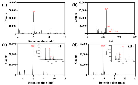 The chromatographic data for the turmeric dye extract are displayed in Figure 2. According to Figure 2a, one prominent peak was found at a retention time of 5.988 min with its molecular ion ([M+H]+ = m/z 369). Its fragment ions were possibly generated due to the loss of one diketocyclopropane ([M+H–C3H2O2]+ = m/z 299), the loss of one 1-hydroxy-3-ketocyclobutene (M+H–C4H4O2)+ = m/z 285), the loss of one 1-hydroxy-5-ketocyclo-1,3-hexadiene (M+H–C6H6O2)+ = m/z 259), and the loss of one aryl group followed by one hydrogen atom (M+H–C7H7O2–H)+ = m/z 245) (Figure 2b). This analytical result suggested the presence of curcumin in the dye extract. The chromatogram detected at a retention time of 5.909 min (Figure 2c) with a molecular ion ([M+H]+ = m/z 339) and fragment ions presumably created by the loss of one water molecule (M+H–H2O)+ = m/z 321), the deduction of one diketocyclopropane ([M+H–C3H2O2]+ = m/z 269), the loss of one 1-hydroxy-3-ketocyclobutene (M+H–C4H4O2)+ = m/z 255), and the subtraction of one 1-hydroxy-5-ketocyclo-1,3-hexadiene (M+H–C6H6O2)+ = m/z 229) (inset I) indicated the presence of demethoxycurcumin. In a related manner, one molecular ion ([M+H]+ at m/z 309) was recorded at a retention time of 5.803 min (Figure 2d) alongside its fragment ions, probably produced by the removal of one diketocyclopropane, one 1-hydroxy-3-ketocyclobutene, and one 1-hydroxy-5-ketocyclo-1,3-hexadiene at m/z 239, 225, and 199, respectively. Another fragment, m/z 215, was possibly formed by the elimination of one hydrogen and one aryl (inset II). This revealed that the bisdemethoxycurcumin component was available [50,51]. The LC-MS results confirmed the existence of curcuminoid-based compounds in the turmeric extract, which would be responsible for providing its yellow shade and functional activities on fibrous substrates.
