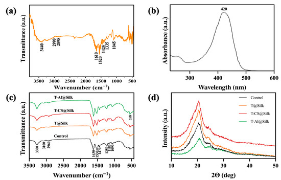 (a) FTIR spectrum of turmeric dye extract, (b) UV-vis spectrum of turmeric dye extract, (c) FTIR spectra of silk samples, and (d) XRD patterns of silk samples.