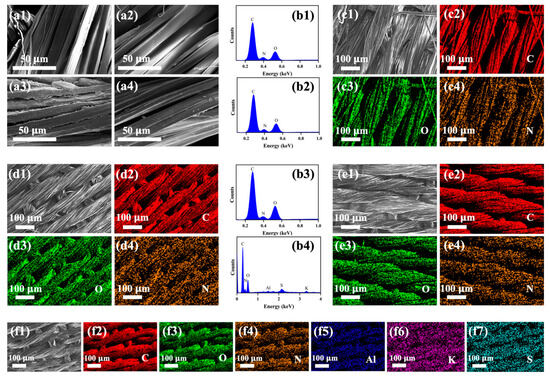 SEM images of silk samples: (a1) pristine silk, (a2) T@Silk, (a3) T-CS@Silk, (a4) T-Al@Silk; EDS spectra of silk samples: (b1) pristine silk, (b2) T@Silk, (b3) T-CS@Silk, (b4) T-Al@Silk; (c1–c4) elemental mappings of pristine silk; (d1–d4) elemental mappings of T@Silk; (e1–e4) elemental mappings of T-CS@Silk; (f1–f7) elemental mappings of T-Al@Silk.