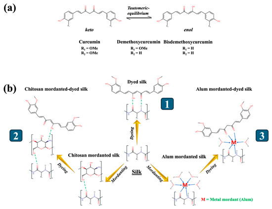 (a) Chemical formulae of curcuminoids in keto and enol forms; (b) proposed schemes of 1. dye-silk complex; 2. dye–chitosan-silk complex; and 3. dye–metal–silk complex.