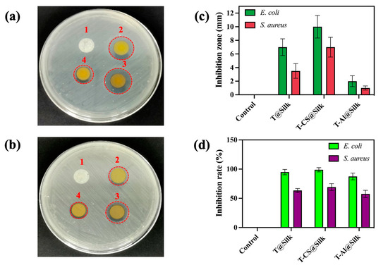 Antibacterial study of silk samples against E. coli and S. aureus: (a) antibacterial circles of silk against E. coli, (b) antibacterial circles of silk against S. aureus (1: Control, 2: T@Silk, 3: T-CS@Silk, 4: T-Al@Silk), (c) measured inhibition zones, (d) bacterial inhibition percentages (%).