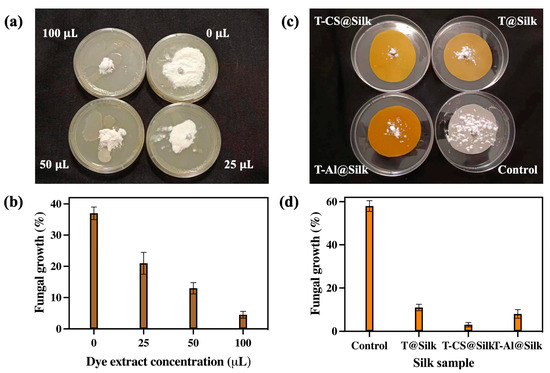 Figure 7 displays the antifungal action of turmeric dye extract and silk samples against white mould. Figure 7a showcases that the fungal growth was considerably suppressed with a low concentration (25 μL) of the dye extract as opposed to the discernible proliferation of fungus in the absence of dye extract (0 μL). The suppression of fungal growth was further amplified upon increasing this concentration to 50 μL and 100 μL. A fungal growth rate of 37% was recorded in the absence of dye extract (0 uL), while a low concentration of dye (25 μL) resulted in 21% growth. This percentage was reduced to 13% and 4.5% using 50 μL and 100 μL dye extract, respectively (Figure 7b). Regarding the silk samples, Figure 7c and d show that the control had a dominating fungal colony and a high growth percentage of 58%, demonstrating the weak antifungal property of silk fibres. The T-CS@Silk sample exhibited the most remarkable fungal suppression with only 3% fungal growth, which was significantly lower than that of the T@Silk (11%) and T-Al@Silk (8%) samples.