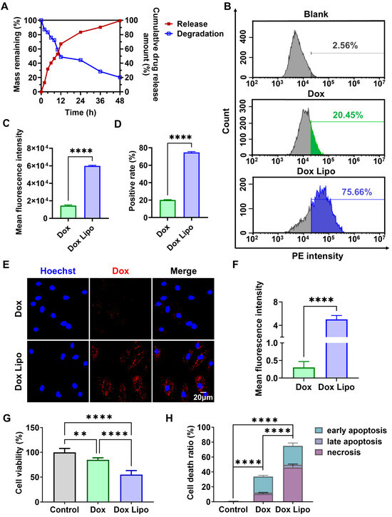 Dox Lipo delivered from BH-gel exerted an optimal anticancer effect. (A) Quantification of BH-gel degradation dynamics and Dox Lipo release rate. (B) Flow cytometry plots showing cellular uptake of Dox Lipo by A549 cells after 4 h of incubation. (C,D) Fluorescence intensities and percentages of positive cells were determined via flowcytometry at the indicated times (n = 3). (E) CLSM images showing the cellular uptake of Dox Lipo (32 µM) by A549 cells after 4 h. The nuclei were stained with Hoechst, and Dox Lipo produced red fluorescence. The merged images represent the overlay of two separate images. Scale bar, 20 µm. (F) Statistical analyses of relative Dox fluorescent intensities in A549 cells were based on ImageJ quantification of randomly selected cells (n = 3) from the corresponding fluorescence images. (G) Cell viability of A549 cells after exposure to Dox and Dox Lipo at a concentration of 32 μM for 24 h. (H) Annexin V-FITC/PI assay for apoptosis detection of A549 cells under the treatment of Dox and Dox Lipo for 24 h. The data are shown as mean ± s.d., ** p < 0.01, and **** p < 0.0001 via Student’s t-tests or one-way ANOVA test.
