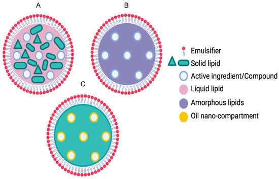 Depending on the production method and the location of the encapsulated molecules, SLNs are classified as different types or models: homogenous matrix (Figure 1A), drug-enriched shell (Figure 1B), or drug-enriched core (Figure 1C). However, SLNs have limitations, mainly related to their low capacity to encapsulate molecules in the lipid matrix and excessive crystallization of the lipid during storage, leading to leakage of the encapsulated molecules. Thereby, more advanced nanocarriers derived from SLNs have been developed, nanostructured lipid carriers (NLCs), which have a solid matrix resulting from the combination of a solid lipid and a liquid lipid, the former in a higher percentage (Figure 2). Based on the location of the encapsulated molecules, there are different types of NLCs: Type 1, or the imperfect type (Figure 2A), occurs when the NLCs have an imperfect solid matrix structure and solid and liquid lipids are mixed in different nanostructures. The second type is the amorphous type (Figure 2B) and is obtained by mixing solid and liquid lipids in such a way as to prevent the formation of a solid crystalline structure, avoiding molecules from leakage during storage. The third type (Figure 2C) is the multiple type. Since lipophilic molecules are more soluble in liquid lipids than in solid lipids, in this type of NLC, there are oil moieties blended into the solid lipid, forming nano-compartments where the molecules are confined. Compared to SLNs, NLCs have been shown to have a higher loading capacity and a greater ability to prevent the release of molecules during storage by inhibiting or reducing the crystallization of lipids. These advantages have been attributed to the presence of the liquid lipid, which results in a more disorganized lipid matrix with more space to accommodate molecules [17,26,27,33,34,35].