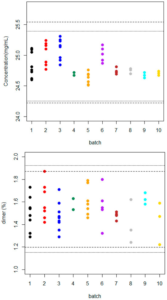 Ten batches from Avastin® (reference product) were analyzed during a period of 10 years. Six batches were analyzed during the period 2015–2021 (for more details, see Oliva and Llabres, 2021) [34]; a further four batches were tested in the period 2022–2024 (one batch in 2022 and the rest during the first semester of 2024), and there were ten batches in total. Table 1 shows the summarized statistics: number of observations per batch and the mean and standard deviation for both quality attributes included in this study (all data are available in the Supplementary Materials). For the 10 batches, overall bevacizumab mean content was 24.82 mg/mL; within-batch standard deviation ranged from 0.035 to 0.209 (coefficient of variation from 0.14 to 0.84%). Overall bevacizumab mean dimer content was 1.559%, and the within-batch standard deviation ranged from 0.034 to 0.195 (coefficient of variation from 2.30 to 13.9%). In this case, the average within-batch variability, expressed as a coefficient of variation (CV), for the drug content was lower than those obtained for the first six batches (0.40% vs. 0.55%) [34], whereas the percent dimer content was similar (8.71% vs. 8.77%), although the problems in the resolution between peaks, detected in the first period [34], were also observed in various batches, reaching a CV close to 14% for batches #8 and #10. However, the last four batches show the lowest CV for the drug content (<0.21%).