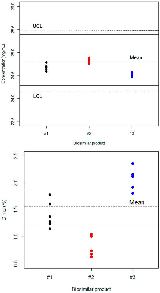 In this work, we tested three bevacizumab biosimilar commercial products manufactured at different times and showing at least 1-year residual shelf lives from six measurements for each batch. Figure 2 shows the plot of the observation by different biosimilar products together with the lower and upper capability limits as well as the β-tolerance intervals calculated for the reference product. In such a scenario, all the biosimilar products comply with the drug content specifications. However, the mean values for biosimilar products #1 and #3 were below the target value and the mean reference product content, whereas biosimilar #1 was very close to the reference product value. However, the situation was totally different for the dimer content, with ranges from 0.808 to 2.083%, whereas the mean value for the reference product was 1.559%. This could be attributed to the distinct manufacturing processes employed for each biosimilar promotor. Biosimilar #1 and #2, which were manufactured using the same manufacturing process, showed differences in dimer content. However, we do not have any information on the level of variability to establish a significant difference. This is an industrial secret. We need more data to determine if there really are differences between batches of the same promotor.