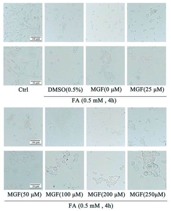 Protective effect of MGF against FA-induced cell morphological changes. HT22 cells were co-treated with MGF (25, 50, 100, 200, 200, and 250 µM) and FA (0.5 mM) for 4 h. Cell morphology was observed using a microscope at different magnifications (upper bar: 50 µM; lower bar: 25 µM).