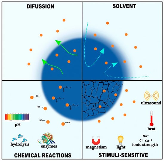 Third-generation nanovectors are multistage agents capable of multiple tasks, such as providing time-controlled release of pharmaceutical compounds from nanoparticles, overcoming biological barriers, and generating distinct subcellular targets [27]. Many studies have reported the release processes of medications within nanocarriers. Several processes, including solvent diffusion, chemical reactions, and stimuli-controlled release, can be used to describe how medications are released from nanocarriers, as shown in Figure 2 [27,28].