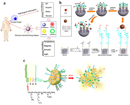 The stimuli-responsive DDS is illustrated schematically (a); the dual-responsive dynamic crosslinked supramolecular network on MSN-SS-(EDA-PGOHMA) and the synthetic approach with CB7 assembly are schematically illustrated in (b); and the temperature-sensitive liposome design is illustrated schematically in (c). Reproduced with permission from [48], which was published under a CC BY license.