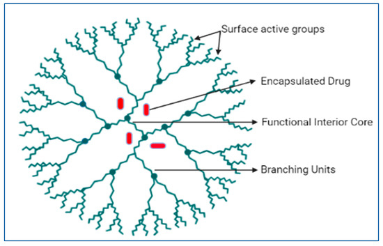 Dendrimer surfaces can be complexed with bioactive ingredients with modifiable units [87]. Thus, dendrimers, by virtue of their structure, can entrap guest molecules, which are mostly lipophilic in the inner cavity. Owing to their monodispersity in size and shape, dendrimers are excellent nanocarriers through which diverse biomolecules can be entrapped either in the inner cavity or adsorbed to the surface or the terminal group of dendrimers. Additionally, dendrimers serve as ideal nanocarriers for increasing their solubility, providing controlled and sustained drug release, targeted delivery, and protection of active moieties from various therapeutic groups [88].