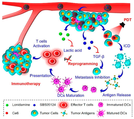 Numerous techniques aided by nanotechnology have been developed to lower the levels of lactate in the TME. These include inhibiting lactate efflux and promoting lactate intake. To reduce intratumoral lacate levels and enhance photodynamic therapy (PDT) against colorectal cancer, a ternary bioregulator delivery system (TerBio) was developed [177]. The TerBio system was developed using chlorin e6 (Ce6), the transforming growth factor (TGF)-β receptor-I inhibitor SB505124 (SB), and the lactate efflux inhibitor lonidamine (LND) at a suitable ratio without the need for extra excipients (Figure 9). TerBiocomplex-mediated PDT inhibited tumor growth and induced immunogenic cell death (ICD), which triggered strong anticancer immune responses. Additionally, the decrease in lactate efflux induced by LND and SB-induced TGF-β downregulation jointly improved antitumor immunity by mitigating the immunosuppressive TMME (Figure 9).