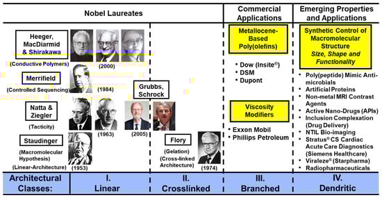 The importance of these major polymer architecture categories is readily apparent by noting historical Nobel laureate recognition associated in the past for pioneering work involving the first three traditional major architecture classes, namely: Categories (I), (II), and (III) as illustrated in Figure 2.