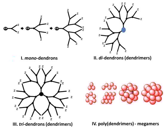 - Tomalia, D.A. Dendrons/Dendrimer: Quantized, nano-element like building blocks for soft-soft and soft-hard nano-compound synthesis. Soft Matter 2010, 6, 456–474. [Google Scholar] [CrossRef]