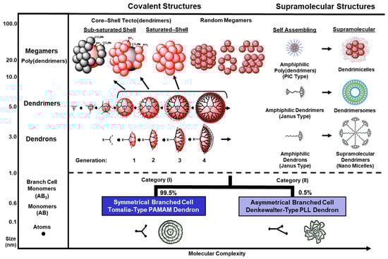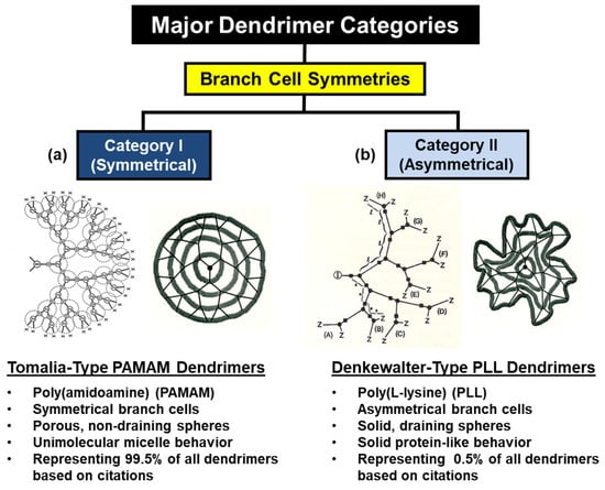 Classification of all dendrons and dendrimers according to branch-cell symmetry, namely: (a) Category (I): symmetrical branch cells represented by Tomalia-type PAMAM dendrimers, which are porous, non-draining spheroids that possess interior void space, exhibit guest–host inclusion complex-formation properties, and account for 99.5% of all literature citations. (b) Category (II): asymmetrical branch cells represented by Denkewalter-type PLL dendrimers, which are protein-like, solid draining spheres and account for 0.5% of all literature citations. Reprinted with permission from Ref. [49]. Copyright 2020, MDPI.