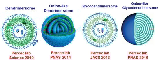 - Percec, V.; Sahoo, D.; Adamson, J. Stimuli-responsive principles of supramolecular organizations emerging from self-assembling and self-organizable dendrons, dendrimers, and dendronized polymers. Polymers 2023, 15, 1832. [Google Scholar] [CrossRef]