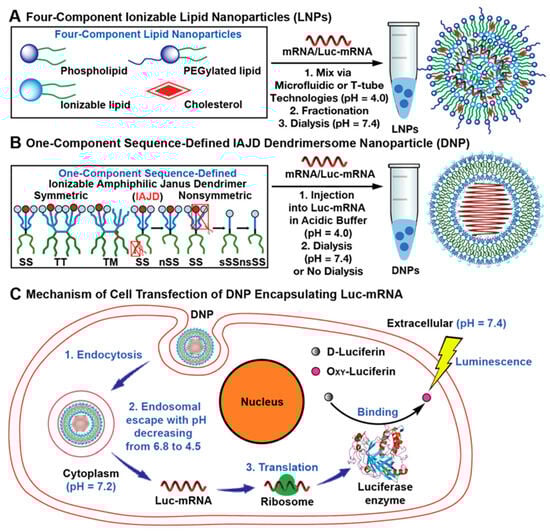 - Zhang, D.; Atochina-Vasserman, E.N.; Maurya, D.S.; Huang, N.; Xiao, Q.; Ona, N.; Liu, M.; Shahnawaz, H.; Ni, H.; Kim, K.; et al. The unexpected importance of the primary structure of the hydrophobic part of one-component ionizable amphiphilic Janus dendrimers in targeted mRNA delivery activity. J. Am. Chem. Soc. 2021, 143, 12315–12327. [Google Scholar] [CrossRef] [PubMed]