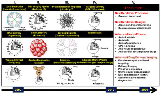 - Tomalia, D.A.; Christensen, J.B.; Boas, U. The past, present, and future for dendrons and dendrimers. In Dendrimers, Dendrons, and Dendritic Polymers: Discovery, Applications and the Future; Cambridge University Press: New York, NY, USA, 2012; pp. 378–406. [Google Scholar]