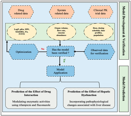 As a strategy of model-informed drug development (MIDD), physiologically-based pharmacokinetic (PBPK) modeling has enhanced the discovery, development, and assessment of many drugs and biologics [19,20]. The PBPK modeling is a quantitative mechanistic approach through which biological processes, including absorption, distribution, metabolism, and elimination (ADME), are described mathematically to predict the pharmacokinetic parameters of drugs. This mathematical modeling tool is being widely used to evaluate the effect of several intrinsic and extrinsic factors (e.g., renal and hepatic impairment, drug interactions, pregnancy) on drug exposure among different patient populations. In hepatic and renal impairment populations, it has been shown that PBPK modeling adequately predicts drug exposure based on the severity of the diseases [21]. PBPK models can be built by the integration of drug-dependent parameters (e.g., lipophilicity, molecular weight, pKa, solubility) and biological system-dependent parameters (e.g., organ volume, enzyme abundance) in a specific PBPK platform [22].