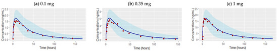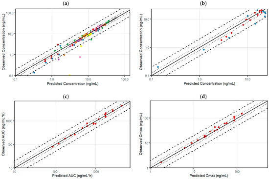 The predictive performance and adequacy of the model were verified initially based on visual inspection of concentration–time profiles with respect to the deviation of observed data points from the simulated mean. A goodness of fit plot was used to assess how well simulated and observed concentrations are fit. In addition, we compared predicted and observed values of AUC_inf and Cmax using the average fold error (AFE) methods, by calculating the ratio of predicted to observed values. The standard two-fold error range was acceptable to verify the model’s predictability. This range has been widely applied and accepted in the field of drug discovery and development as mentioned previously [36,37].