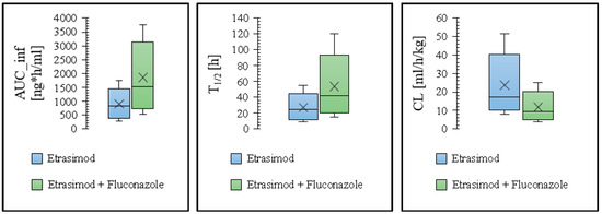 Box and Whisker plots depicting the predicted PK parameters for etrasimod with and without the perpetrators. The lower Whisker represents the minimum value, the lower edge of the box indicates the 25th percentile, the line within the box marks the median, the upper edge of the box shows the 75th percentile, the upper Whisker represents the maximum value, and the × sign represent the mean.